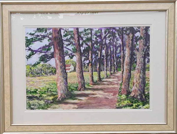 This magnificent avenue of trees leads to a wine producing domaine and is rather typical of domaine entrances. It has been framed and is for sale. The painting is acrylic and is framed in a understated gold frame which measures 62cm x 48cm. It has a double mount in off white and the painting size is 44cm x 30cm. The price is £450.00.